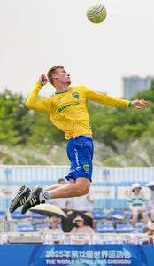 (250809) — CHENGDU, 9 agosto, 2025 (Xinhua) — Bruno Arnold, de Brasil, compite durante el partido del grupo A de la ronda preliminar masculina del evento de fistball entre Alemania y Brasil en los Juegos Mundiales 2025, en Chengdu, en la provincia de Sichuan, en el suroeste de China, el 9 de agosto de 2025. (Xinhua/Tenzin Nyida) (oa) (da)