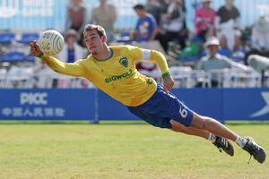 (250812) — CHENGDU, 12 agosto, 2025 (Xinhua) — Gabriel Petry Heck, de Brasil, compite durante el partido de semifinal masculina de fistball entre Brasil y Suiza en los Juegos Mundiales 2025, en Chengdu, en la provincia de Sichuan, en el suroeste de China, el 12 de agosto de 2025. (Xinhua/Chen Cheng) (jg) (ra) (vf)