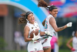 (250817) -- CHENGDU, 17 agosto, 2025 (Xinhua) -- Allison Salazar (i), y Zara Galán, de México festejan una anotación durante el partido por la medalla de oro de las finales femeninas de fútbol bandera entre Estados Unidos y México, en los Juegos Mundiales 2025, en Chengdu, en la provincia de Sichuan, en el suroeste de China, el 17 de agosto de 2025. (Xinhua/Jiang Hongjing) (rtg) (ah)