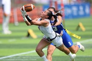 (250815) -- CHENGDU, 15 agosto, 2025 (Xinhua) -- Mónica Rangel (frente), de México, atrapa el balón durante el partido del grupo B de la ronda preliminar femenina de fútbol bandera entre México e Italia, en los Juegos Mundiales 2025, en Chengdu, en la provincia de Sichuan, en el suroeste de China, el 15 de agosto de 2025. (Xinhua/Chen Bin) (jg) (rtg) (ce)