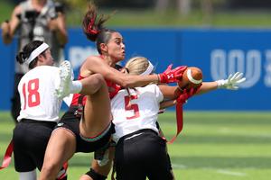 (250814) -- CHENGDU, 14 agosto, 2025 (Xinhua) -- Victoria Chávez (c), de México, disputa el balón con Kanatani Asahi (d), de Japón, durante el partido del grupo B de la ronda preliminar femenina de fútbol bandera entre México y Japón en los Juegos Mundiales 2025, en Chengdu, en la provincia de Sichuan, en el suroeste de China, el 14 de agosto de 2025. (Xinhua/Chen Bin) (rtg) (ra) (ce)