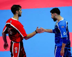 (250814) — CHENGDU, 14 agosto, 2025 (Xinhua) — Dimitrios Economo (i), de Grecia, saluda a Héctor Solorio, de México, al término del combate final por la medalla de oro masculinos por puntos -84 kg de kickboxing en los Juegos Mundiales 2025, en Chengdu, en la provincia de Sichuan, en el suroeste de China, el 14 de agosto de 2025. (Xinhua/Chen Xinbo) (jg) (ah) (vf)