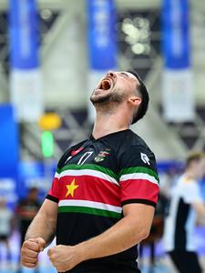 (250813) -- CHENGDU, 13 agosto, 2025 (Xinhua) -- Imagen del 12 de agosto de 2025 de Wayne Stienstra, de Surinam, festejando durante el partido por el quinto lugar de las finales de equipos mixtos entre Alemania y Surinam del evento korfball, en los Juegos Mundiales 2025, en Chengdu, en la provincia de Sichuan, en el suroeste de China. (Xinhua/Jiang Kehong) (ah) (ra) (ce)