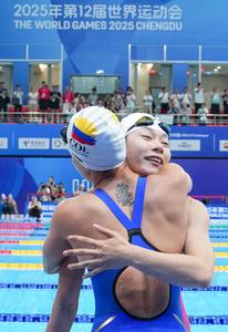 (250811) -- CHENGDU, 11 agosto, 2025 (Xinhua) -- Hu Yaoyao (d), del equipo de China, abraza a una atleta del equipo de Colombia, al término de la final femenina de relevos en superficie 4x50 m del evento de natación con aletas en los Juegos Mundiales 2025, celebrados en Chengdu, provincia de Sichuan, suroeste de China, el 11 de agosto de 2025. (Xinhua/Zhang Liyun) (oa) (ah) (vf)