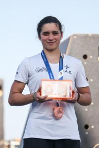 (250812) -- CHENGDU, 12 agosto, 2025 (Xinhua) -- La medallista de bronce Sara Banchoff Tzancoff, de Argentina, posa durante la ceremonia de premiación de la final de velocidad femenina del evento de parkour en los Juegos Mundiales 2025, en Chengdu, en la provincia de Sichuan, en el suroeste de China, el 12 de agosto de 2025. (Xinhua/Wang Xiang) (jg) (ra)