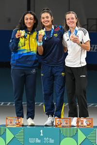 (250814) -- CHENGDU, 14 agosto, 2025 (Xinhua) -- Las medallistas de oro, Gabriela Rueda (c), de Colombia, y Gabriela Vargas Sarmiento (i), de Ecuador, posan con la medallista de bronce, Larissa Ursula Gaiser, de Alemania, durante la ceremonia de premiación de la carrera de 5000 m por puntos femenina de patinaje de velocidad en línea en pista, en los Juegos Mundiales 2025, en Chengdu, en la provincia de Sichuan, en el suroeste de China, el 14 de agosto de 2025. (Xinhua/Xie Jianfei) (rtg) (ra) (ce)