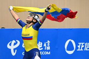 (250814) -- CHENGDU, 14 agosto, 2025 (Xinhua) -- Gabriela Vargas Sarmiento, de Ecuador, festeja al término de la final de la carrera de 5000 m por puntos femenina de patinaje de velocidad en línea en pista, en los Juegos Mundiales 2025, en Chengdu, en la provincia de Sichuan, en el suroeste de China, el 14 de agosto de 2025. (Xinhua/Xie Jianfei) (rtg) (ra) (ce)
