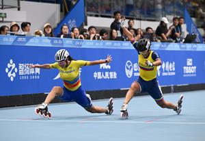 (250815) -- CHENGDU, 15 agosto, 2025 (Xinhua) -- Gabriela Rueda (i), de Colombia, y Gabriela Vargas Sarmiento, de Ecuador, cruzan la línea de meta al término de la final de la carrera de eliminación femenina de 10000 m de patinaje de velocidad en línea en pista, en los Juegos Mundiales 2025, en Chengdu, en la provincia de Sichuan, en el suroeste de China, el 15 de agosto de 2025. (Xinhua/Zhang Bowen) (oa) (ra) (ce)
