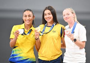 (250815) -- CHENGDU, 15 agosto, 2025 (Xinhua) -- La medallista de oro, Gabriela Rueda (c), de Colombia, la medallista de plata, Gabriela Vargas Sarmiento (i), de Ecuador, y la medallista de bronce, Marine Lefeuvre, de Francia, posan durante la ceremonia de premiación al término de la final de la carrera de eliminación femenina de 10000 m de patinaje de velocidad en línea en pista, en los Juegos Mundiales 2025, en Chengdu, en la provincia de Sichuan, en el suroeste de China, el 15 de agosto de 2025. (Xinhua/Zhang Bowen) (oa) (ra) (ce)