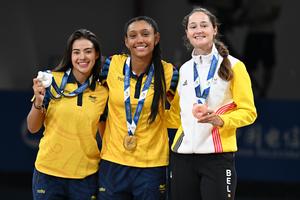 (250815) -- CHENGDU, 15 agosto, 2025 (Xinhua) -- La medallista de oro María Fernanda Timms Ariza (c), la medallista de plata Gabriela Rueda, de Colombia, y la medallista de bronce Fran Vanhoutte, de Bélgica, posan durante la ceremonia de premiación de esprint femenino 1000 m de patinaje de velocidad en línea en pista en los Juegos Mundiales 2025, en Chengdu, en la provincia de Sichuan, en el suroeste de China, el 15 de agosto de 2025. (Xinhua/Xie Jianfei) (oa) (ra) (vf)