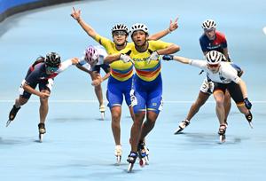 (250815) -- CHENGDU, 15 agosto, 2025 (Xinhua) -- María Fernanda Timms Ariza (d-frente) y Gabriela Rueda (i-frente), de Colombia, festejan al término de la final de esprint femenino 1000 m de patinaje de velocidad en línea en pista en los Juegos Mundiales 2025, en Chengdu, en la provincia de Sichuan, en el suroeste de China, el 15 de agosto de 2025. (Xinhua/Zhang Bowen) (oa) (ra) (vf)