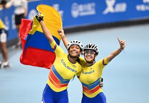 (250815) -- CHENGDU, 15 agosto, 2025 (Xinhua) -- María Fernanda Timms Ariza (i) y Gabriela Rueda, de Colombia, festejan al término de la final de esprint femenino 1000 m de patinaje de velocidad en línea en pista en los Juegos Mundiales 2025, en Chengdu, en la provincia de Sichuan, en el suroeste de China, el 15 de agosto de 2025. (Xinhua/Zhang Bowen) (oa) (ra) (vf)