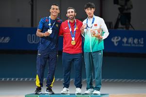 (250814) -- CHENGDU, 14 agosto, 2025 (Xinhua) -- El medallista de oro Jhoan Sebastián Guzmán Bitar (c), de España, el medallista de plata Jhon Edwar Tascón Holguín (i), de Colombia, y el medallista de bronce Zhang Zhenhai, de China, posan durante la ceremonia de premiación de esprint masculino 500 m +D de patinaje de velocidad en línea en pista en los Juegos Mundiales 2025, en Chengdu, en la provincia de Sichuan, en el suroeste de China, el 14 de agosto de 2025. (Xinhua/Xie Jianfei) (rtg) (ra) (vf)