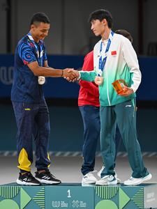 (250814) -- CHENGDU, 14 agosto, 2025 (Xinhua) -- El medallista de de bronce Zhang Zhenhai (d), de China, saluda al medallista de plata Jhon Edwar Tascón Holguín, de Colombia, durante la ceremonia de premiación de esprint masculino 500 m +D de patinaje de velocidad en línea en pista en los Juegos Mundiales 2025, en Chengdu, en la provincia de Sichuan, en el suroeste de China, el 14 de agosto de 2025. (Xinhua/Xie Jianfei) (rtg) (ra) (vf)