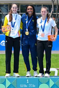 (250812) -- CHENGDU, 12 agosto, 2025 (Xinhua) -- La medallista de oro María Fernanda Timms Ariza (c), de Colombia, la medallista de plata Fran Vanhoutte (i), de Bélgica, y la medallista de bronce Anna-Laethisia Schimek, de Alemania, posan durante la ceremonia de premiación de 1 vuelta femenina del evento de patinaje de velocidad en línea en ruta en los Juegos Mundiales 2025, en Chengdu, en la provincia de Sichuan, en el suroeste de China, el 12 de agosto de 2025. (Xinhua/Xie Jianfei) (jg) (ra) (vf)