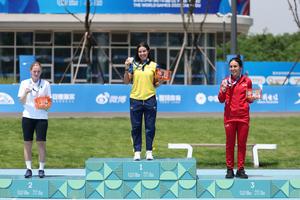 (250813) -- CHENGDU, 13 agosto, 2025 (Xinhua) -- La medallista de oro Gabriela Rueda (c), de Colombia, la medallista de plata Marine Lefeuvre (i), de Francia, y la medallista de bronce Valentina Alejandra Letelier Cartagena, de México, posan durante la ceremonia de premiación de la carrera eliminatoria femenina de 15.000 m de patinaje de velocidad en línea en ruta en los Juegos Mundiales 2025, en Chengdu, en la provincia de Sichuan, en el suroeste de China, el 13 de agosto de 2025. (Xinhua/Chen Bin) (jg) (da) (vf)
