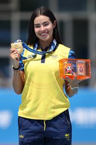 (250813) -- CHENGDU, 13 agosto, 2025 (Xinhua) -- Gabriela Rueda, de Colombia, posa durante la ceremonia de premación de la carrera eliminatoria femenina de 15.000 m de patinaje de velocidad en línea en ruta en los Juegos Mundiales 2025, en Chengdu, en la provincia de Sichuan, en el suroeste de China, el 13 de agosto de 2025. (Xinhua/Chen Bin) (jg) (da) (vf)