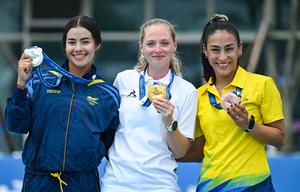 (250812) -- CHENGDU, 12 agosto, 2025 (Xinhua) -- La medallista de oro Marine Lefeuvre (c), de Francia, la medallista de plata Gabriela Rueda (i), de Colombia, y la medallista de bronce Gabriela Vargas Sarmiento, de Ecuador, posan durante la ceremonia de premiación de la carrera por puntos femenina de 10.000 m del evento de patinaje de velocidad en línea en ruta en los Juegos Mundiales 2025, en Chengdu, en la provincia de Sichuan, en el suroeste de China, el 12 de agosto de 2025. (Xinhua/Xie Jianfei) (jg) (ra) (vf)