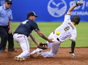 (250808) -- CHENGDU, 8 agosto, 2025 (Xinhua) -- Yasumi Kotaro (d), de Japón, compite durante el partido del grupo A de la ronda preliminar de sóftbol masculino entre Japón y Argentina en los Juegos Mundiales 2025, en Chengdu, en la provincia de Sichuan, en el suroeste de China, el 8 de agosto de 2025. (Xinhua/Feng Kaihua) (oa) (ra)