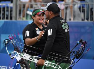 (250808) -- CHENGDU, 8 agosto, 2025 (Xinhua) -- Sebastián García Flores (d)/Andrea Maya Becerra Arizaga, de México, festejan al término del encuentro de semifinal de compuesto por equipos mixtos del evento de tiro con arco entre Estados Unidos y México en los Juegos Mundiales 2025, en Chengdu, en la provincia de Sichuan, en el suroeste de China, el 8 de agosto de 2025. (Xinhua/Li Jianan) (rtg) (ra) (ce)