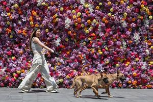 (250802) — CHONGQING, 2 agosto, 2025 (Xinhua) — Una mujer pasea a sus perros bajo el sol, en el distrito de Jiangbei, en la municipalidad de Chongqing, en el suroeste de China, el 2 de agosto de 2025. Chongqing emitió el sábado una alerta por ola de calor, con temperaturas máximas alcanzando los 40-43 grados centígrados. (Xinhua/Chen Cheng) (jg) (da)
