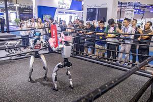 (250904) -- CHONGQING, 4 septiembre, 2025 (Xinhua) -- Periodistas e invitados observan un juego de boxeo de robots en el estand de Unitree, en la sede de la Exposición Mundial de la Industria Inteligente 2025, en Chongqing, en el suroeste de China, el 4 de septiembre de 2025. La exposición está programada del 5 al 8 de septiembre en Chongqing para presentar los logros de vanguardia de la industria inteligente mediante exposiciones profesionales. (Xinhua/Tang Yi) (da) (ra) (ce)