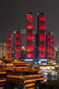 (251003) -- CHONGQING, 3 octubre, 2025 (Xinhua) -- Imagen del 30 de septiembre de 2025 del Templo Qianfo y las torres del Raffles City Chongqing detrás de él, en Chongqing, en el suroeste de China. Chongqing, una ciudad donde la tradición y la modernidad coexisten de una manera sorprendente, está atrayendo una enorme afluencia de turistas durante los ocho días de vacaciones del Día Nacional y el Festival de Medio Otoño que comenzaron el miércoles. (Xinhua/Chen Cheng) (jg) (rtg) (vf)