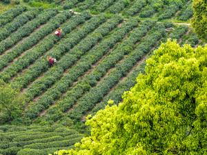 (260327) -- CHONGQING, 27 marzo, 2026 (Xinhua) -- Imagen tomada con un dron el 27 de marzo de 2026 de agricultoras recolectando hojas de té, en el distrito de Rongchang, en Chongqing, en el suroeste de China. La industria del té es una especialidad agrícola local en Rongchang, y la superficie de cultivo abarca 43.000 mu (aproximadamente 2.866,67 hectáreas). A medida que el clima se vuelve más cálido, los jardines de té entran en su temporada alta de cosecha. (Xinhua/Tang Yi) (jg) (da) (ce)