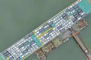 (251211) — CHONGQING, 11 diciembre, 2025 (Xinhua) — Imagen tomada con un dron del 5 de diciembre de 2025 de vehículos de nueva energía destinados a la exportación siendo cargados a un buque de transporte en un muelle, en Chongqing, en el suroeste de China. En los últimos años, a medida que Chongqing aceleró su transformación en un centro interior para la apertura, un número creciente de vehículos de fabricación local ha llegado a los mercados extranjeros. (Xinhua/Huang Wei) (da) (ra) (vf)