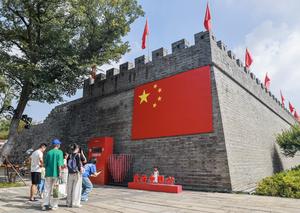 (251001) -- BEIJING, 1 octubre, 2025 (Xinhua) -- Una niña se toma fotografías con la bandera nacional en una antigua muralla de la ciudad, en el distrito de Nanhu de la ciudad de Jiaxing, en la provincia de Zhejiang, en el este de China, el 1 de octubre de 2025. El 76º aniversario de la fundación de la República Popular China se celebró el miércoles de diversas maneras en todo el país. (Xinhua/Xu Yu) (jg) (ra) (ce)