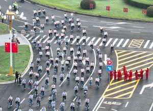 (251001) -- BEIJING, 1 octubre, 2025 (Xinhua) -- Vista aérea tomada con un dron el 1 de octubre de 2025 de personas participando en una actividad de conducción en bicicleta para celebrar el 76º aniversario de la fundación de la República Popular China, en Huaian, en la provincia de Jiangsu, en el este de China. El 76º aniversario de la fundación de la República Popular China se celebró el miércoles de diversas maneras en todo el país. (Xinhua/Ji Chunpeng) (jg) (ra) (ce)