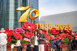 (251001) -- BEIJING, 1 octubre, 2025 (Xinhua) -- Turistas se toman fotografías frente a un conjunto de instalaciones florales para conmemorar el 70° aniversario de fundación de la región autónoma uygur de Xinjiang, en Urumqi, en la región autónoma uygur de Xinjiang, en el noroeste de China, el 1 de octubre de 2025. El 76º aniversario de la fundación de la República Popular China se celebró el miércoles de diversas maneras en todo el país. (Xinhua/Xu Hongyan) (jg) (ra) (ce)