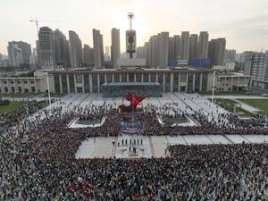 (251001) -- BEIJING, 1 octubre, 2025 (Xinhua) -- Vista aérea tomada con un dron el 1 de octubre de 2025 de personas asistiendo a una ceremonia de izamiento de bandera, en Shijiazhuang, en la provincia de Hebei, en el norte de China. El 76º aniversario de la fundación de la República Popular China se celebró el miércoles de diversas maneras en todo el país. (Xinhua/Liang Zidong) (ah) (ce)