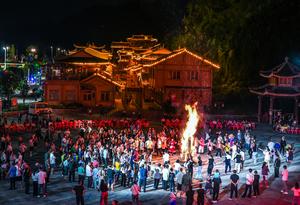 (251006) -- BEIJING, 6 octubre, 2025 (Xinhua) -- Imagen del 5 de octubre de 2025 de turistas y residentes bailando alrededor de una fogata en un punto escénico, en el distrito de Qinglong, en la provincia de Guizhou, en el suroeste de China. A medida que convergen las vacaciones por el Día Nacional de China y el Festival del Medio Otoño, las actividades culturales, las activas redes de transporte y las innovadoras escenas de consumo del país están pintando un panorama vívido de resiliencia económica y potencial de crecimiento. (Xinhua/Yang Wenbin) (rtg) (ah) (vf)