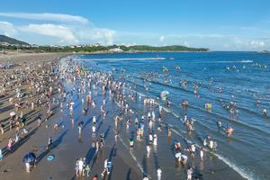 (251002) -- BEIJING, 2 octubre, 2025 (Xinhua) -- Vista aérea tomada con un dron el 2 de octubre de 2025 de turistas divirtiéndose en una playa, en Zhoushan, en la provincia de Zhejiang, en el este de China. Los destinos turísticos a través de China están atestiguando un incremento en visitantes mientras las vacaciones de ocho días por el Día Nacional y el Festival de Medio Otoño del país comenzaron el miércoles. (Xinhua/Zou Xunyong) (rtg) (ra) (ce)