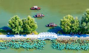 (251007) -- BEIJING, 7 octubre, 2025 (Xinhua) -- Imagen tomada con un dron el 7 de octubre de 2025 de turistas navegando en botes en el Parque Nacional del Humedal de Lixiahe, en la ciudad de Xinghua, en la provincia de Jiangsu, en el este de China. Turistas de todo el país no muestran señales de que su entusiasmo disminuya a medida que las vacaciones por el Día Nacional y el Festival del Medio Otoño llegan a su fin. (Xinhua/Zhou Shegen) (oa) (ah) (ce)