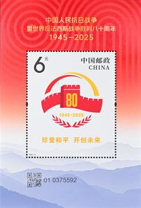 (250903) -- BEIJING, 3 septiembre, 2025 (Xinhua) -- Imagen de una hoja de recuerdo de los sellos conmemorativos emitidos por el Correo de China para conmemorar el 80º aniversario de la victoria en la Guerra de Resistencia del Pueblo Chino contra la Agresión Japonesa y la Guerra Mundial Antifascista, el 3 de septiembre de 2025. Se emitieron un total de 6 millones de juegos de sellos, cada uno de los cuales contiene 13 sellos. También se emitieron 5 millones de hojas en miniatura. (Xinhua/Li He) (jg) (da) (ce)