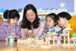 (250320) -- BEIJING, 20 marzo, 2025 (Xinhua) -- Niñas pintan huevos de colores con la guía de una maestra en un jardín de niños, en la aldea de Gecun de la ciudad de Jurong, en la provincia de Jiangsu, en el este de China, el 20 de marzo de 2025. El equinoccio de primavera, o Chunfen en chino, el cuarto período solar en el calendario lunar chino, cae el 20 de marzo de este año. (Xinhua/Zhong Xueman) (da) (ra) (vf)