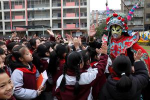 (250217) -- GUANG'AN, 17 febrero, 2025 (Xinhua) -- Un actor realiza el cambio de cara de la Opera de Sichuan para estudiantes en una escuela primaria en Guang'an, en la provincia de Sichuan, en el suroeste de China, el 17 de febrero de 2025. Con una mezcla de nervios y emoción, muchos estudiantes en China asistieron a su primera clase especial del nuevo semestre. (Xinhua/Liao Xiaobing) (rtg) (oa) (vf)
