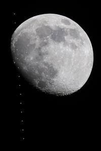 (260101) -- BEIJING, 1 enero, 2026 (Xinhua) -- Imagen compuesta apilada tomada el 31 de diciembre de 2025 en Beijing, China, de la estación espacial china pasando frente a la Luna. (Xinhua/Wang Zicheng) (jg) (ah) (vf)