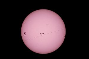(260116) -- BEIJING, 16 enero, 2026 (Xinhua) -- Imagen compuesta apilada tomada el 16 de enero de 2026 en Beijing, capital de China, de la estación espacial china pasando frente al Sol. (Xinhua/Zhong Yi) (jg) (da) (vf)