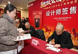 (260105) -- BEIJING, 5 enero, 2026 (Xinhua) -- Diseñadores de estampillas especiales conmemorativas del Año del Caballo firman estampillas para los coleccionistas de estampillas, en Beijing, capital de China, el 5 de enero de 2026. China Post presentó el lunes una serie de dos estampillas especiales para celebrar el próximo Año del Caballo del zodíaco chino. (Xinhua/Li He) (oa) (ah) (vf)
