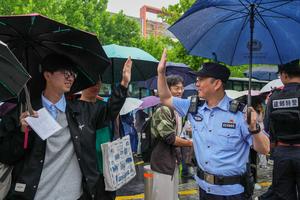 (250607) — NANJING, 7 junio, 2025 (Xinhua) — Un policía saluda a un estudiante afuera de un sitio del examen nacional de acceso a la universidad, en Nanjing, en la provincia de Jiangsu, en el este de China, el 7 de junio de 2025. El examen nacional de ingreso a la universidad de este año, también conocido como gaokao, comenzó el sábado en todo el país. Un total de 13,35 millones de estudiantes chinos se presentarán al examen de este año. (Xinhua/Li Bo) (oa) (da)