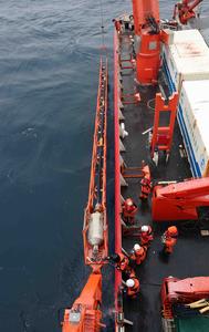 (250212) -- A BORDO DEL XUELONG 2, 12 febrero, 2025 (Xinhua) -- Imagen del 9 de febrero de 2025 de miembros del equipo de la 41ª expedición científica antártica de China soltando equipamiento para recolectar muestras de sedimentos marinos a bordo del rompehielos de investigación chino Xuelong 2. El rompehielos de investigación chino Xuelong 2, o Dragón de Nieve 2, está realizando un estudio del ecosistema marino de un mes de duración en el mar de Amundsen, que incluye una investigación y monitoreo integral de la ecología biológica, el medio acuático, sedimentario y atmosférico, y la distribución de contaminantes. (Xinhua/Huang Taoming) (jg) (da) (vf)