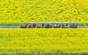 (260404) -- BEIJING, 4 abril, 2026 (Xinhua) -- Vista aérea tomada con un dron el 4 de abril de 2026 de personas viajando en tren para hacer turismo en un campo de flores durante el feriado del Festival Qingming, en el distrito de Xuyi, en la provincia de Jiangsu, en el este de China. (Xinhua/Xu Changyin) (jg) (da)