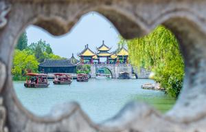 (250430) -- BEIJING, 30 abril, 2025 (Xinhua) -- Vista aérea tomada con un dron el 30 de abril de 2025 de turistas visitando el punto escénico del Esbelto Lago del Oeste, en Yangzhou, en la provincia de Jiangsu, en el este de China. El número de visitantes a las atracciones turísticas de todo el país ha aumentado a medida que se acerca el feriado del Primero de Mayo. Como uno de los tres feriados más largos de China, se espera que el próximo feriado de cinco días, del 1 al 5 de mayo, experimente un auge turístico. (Xinhua/Zhou Shegen) (ah) (ra) (ce)
