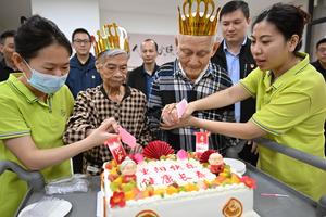 (251029) -- BEIJING, 29 octubre, 2025 (Xinhua) -- Dos personas mayores cortan un pastel de cumpleaños en un centro de atención para ancianos, en el distrito de Qiongshan de Haikou, en la provincia de Hainan, en el sur de China, el 29 de octubre de 2025. Una serie de actividades se llevaron a cabo en todo el país con motivo del Festival Chongyang, también conocido como el Día de los Ancianos en China, que honra las virtudes tradicionales del país de piedad filial y amor familiar. (Xinhua/Guo Cheng) (jg) (da) (ce)