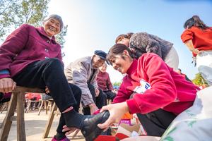 (251028) -- BEIJING, 28 octubre, 2025 (Xinhua) -- Una empleada ayuda a una persona mayor a ponerse un par de zapatos donados, en la aldea de Baimiao, en la ciudad de Zhumadian, en la provincia de Henan, en el centro de China, el 28 de octubre de 2025. Una serie de actividades festivas se celebraron en todo el país para conmemorar el Festival Chongyang de China, que este año se celebra el 29 de octubre. Conocido también como el Día de los Ancianos en China, este festival pone de relieve el cuidado que la sociedad presta a las personas de edad avanzada. (Xinhua/Zhao Yongtao) (oa) (ah) (ce)