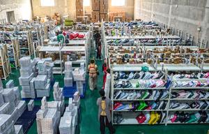 (251111) -- BEIJING, 11 noviembre, 2025 (Xinhua) -- Imagen tomada con un dron el 11 de noviembre de 2025 de empleados organizando mercancías en un centro de gestión de envíos internacionales, en la ciudad de Rongcheng, en la provincia de Shandong, en el este de China. Las compañías de comercio electrónico y logística a lo largo de China están trabajando a plena capacidad durante el festival anual de compras "Doble Once". (Xinhua/Li Xinjun) (oa) (ah) (ce)
