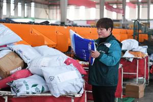 (251110) -- BEIJING, 10 noviembre, 2025 (Xinhua) -- Imagen del 9 de noviembre de 2025 de una repartidora clasificando paquetes en una rama de China Post, en el distrito de Xiayi de Shangqiu, en la provincia de Henan, en el centro de China. Las compañías de comercio electrónico y logística a lo largo de China se encuentran ocupadas vendiendo, empaquetando y entregando mercancía en vísperas del festival anual de compras "Doble Once", que cae el 11 de noviembre. (Xinhua/Miao Yucai) (rtg) (ah) (ce)